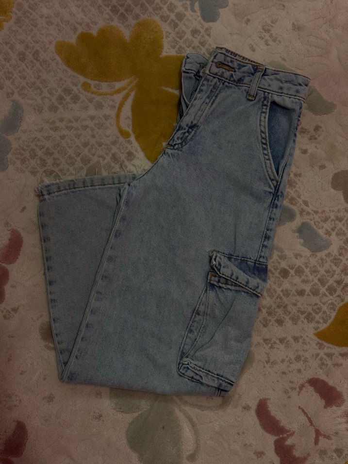 Gevşek kesim, midi boy mavi kot pantolon, tokalı detaylı ve günlük sokak stili için uygundur.