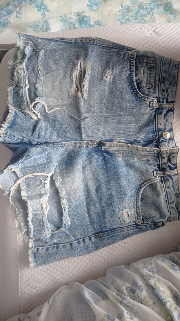 Gevşek kesim, soluk mavi renkli, yırtık detaylı ve tokalı bel bantlı mini kot şort, günlük sokak stili için uygun.