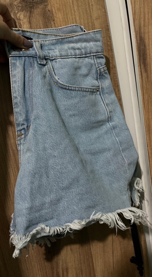 Gevşek kesim, açık mavi kot şort, tokalı detay ve yıpranmış etek ucu ile günlük sokak stiline uygundur.