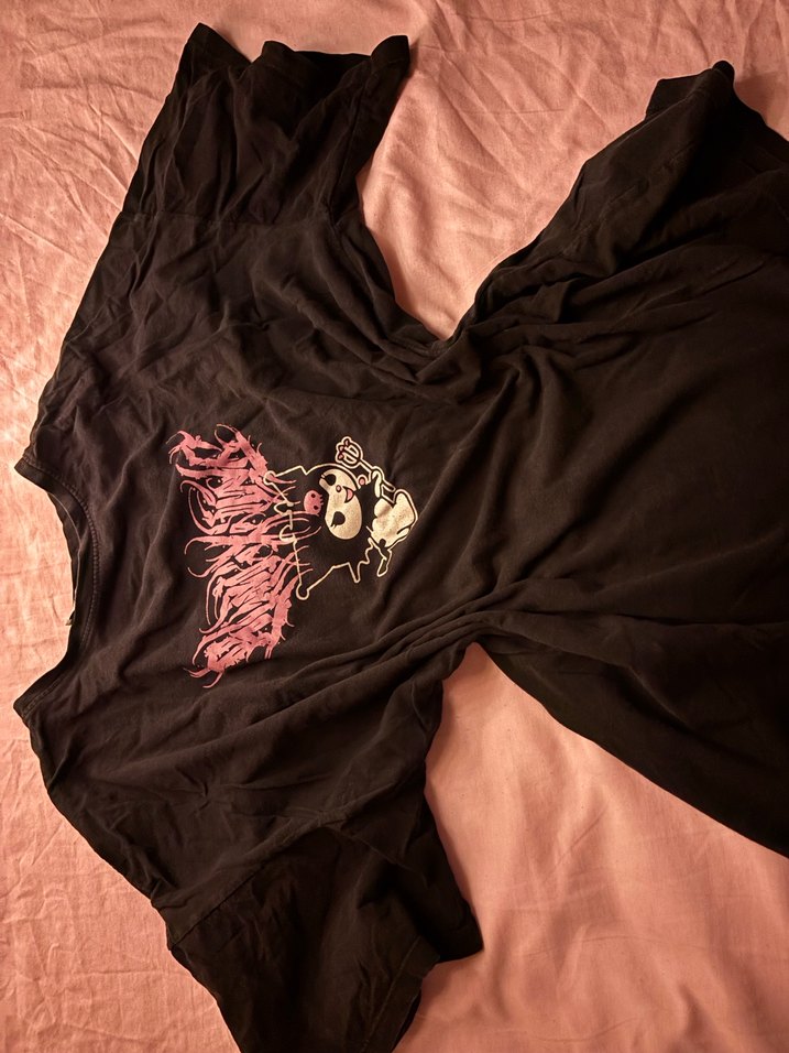 Gevşek kesim, kısa kollu, yuvarlak yaka tişört. Rengi hafif solmuş ve baskısında kırıklar var.