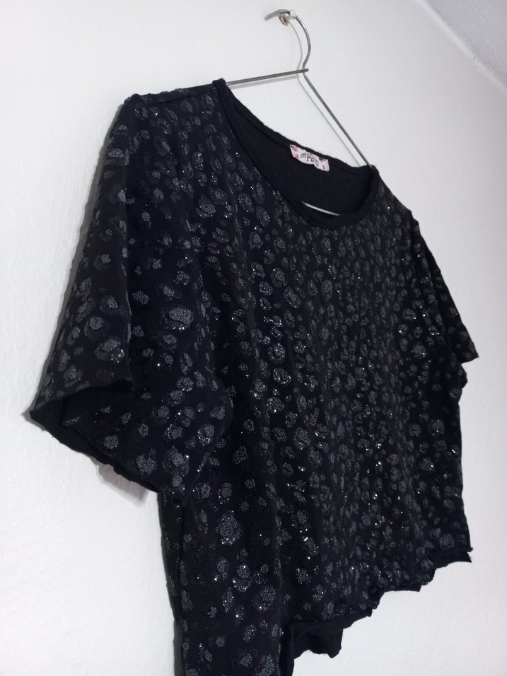 Yuvarlak yakalı, kısa kollu, gevşek kesim siyah mini bluz. Baskılı ve fırfırlı detaylara sahip. Günlük kullanıma uygun goth ve grunge punk tarzında. Ürün kullanılmadı, etiketi mevcut değil