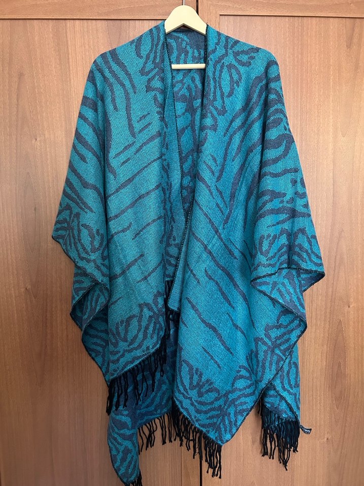 , gevşek kesim turkuaz batik desenli tekstil panço. Midi boy ve püsküllü, bohem tarzda günlük kullanım için uygun.