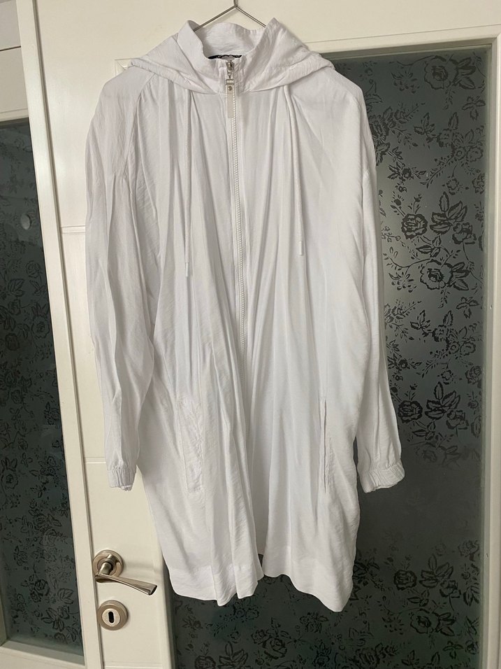Uzun, gevşek kesim kapşonlu ceket drapeli tasarıma sahiptir. Uzun kollu, yüksek yakalı ve fermuarlı olup, beyaz renkte minimalist sokak stili sunar.