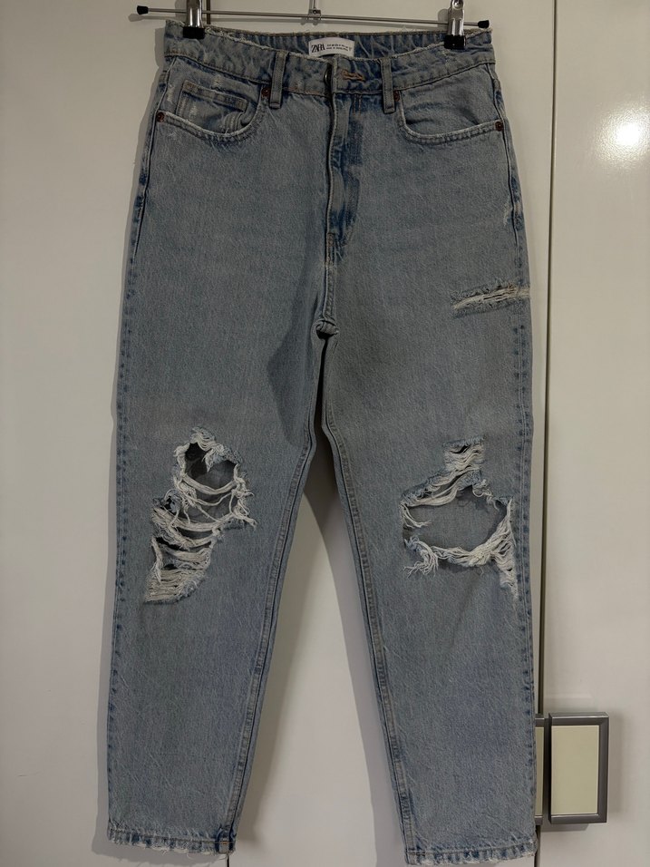 Gevşek kesim, yırtık detaylı mavi kot pantolon, tokalı bel kısmıyla günlük rahat kullanım için uygundur.
