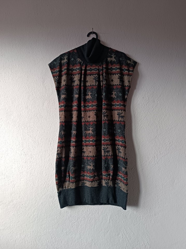 Purlin marka boğazlı, kolsuz, bol kesimli ve geyik desenli füme renk triko kumaştan midi boy bohem elbise. Rahat ve günlük kullanıma uygun. XL beden. İki koltuk arası genişliği 50 cm, boyu 88 cm dir. Yüzde 78.5 akrilik 19 naylon 2.5 elestan. Bu sayfadaki ürünler, ek gelir amaçlı satışta değildir. İkinciel butik satış fiyatlarıdır ve bu sebeple fiyat sondur. Sadece toplu alımlarda indirimden faydalanabilirsiniz. (üç ürün yüzde 5, beş ürün yüzde 15) Aynı gün kargoya verilir. Instagram: @namaste.vintage