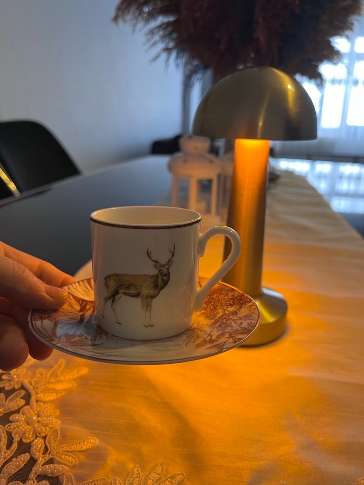 Kahverengi tonlarında, geyik figürlü kahve fincanı ve tabağı seti, sıcak ve samimi ortamlar için uygun ☕.