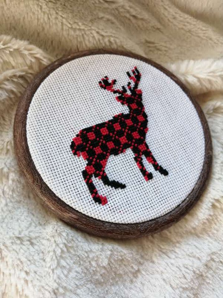 El işi bohem tarzda, kırmızı siyah geyik deseni işlenmiş kanaviçe, ahşap çerçeveli duvar süsü. İç çapı 12 cmdir dilenirse daha büyük kasnakta isimli işleme de yapabilirim #etamin #kanaviçe #crossstitch #etamintablo #geyik