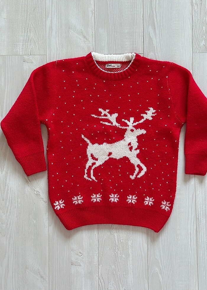 Geyik Desenli Kırmızı Kazak