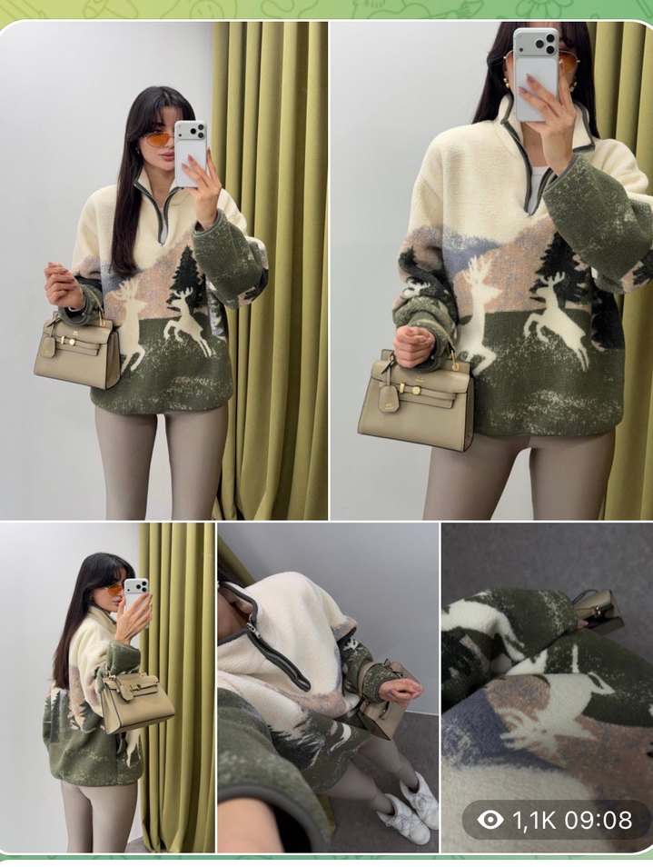 Geyik desenli, yüksek yakalı, uzun kollu, bol kesim kadın sweatshirt. Yumuşak tüylü detaylar ve camel-gri tonlarıyla günlük rahat sokak stili için uygun. 36-40 a uygun marka temsili güncel ürün
