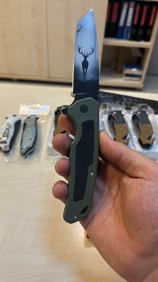 Kahverengi tonlarında, geyik figürlü bıçağı ile katlanabilir yapıda ve kaymaz tutuşlu bir sapı vardır. Keskin ve detaylı bir bıçak. ️
