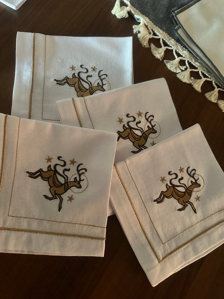 35*35 cm ölçülerinde,pamuk kumaş üzerine geyik işlemeli servis peçetesi.Yıkanabilir ve ütülenebilir kumaş.Yeni ve defosuzdur.ilan 6 adet kumaş peçete için geçerlidir. ❌❌iade yoktur❌❌Teklif gönderip satın almayan hesaplar engellenir❌❌