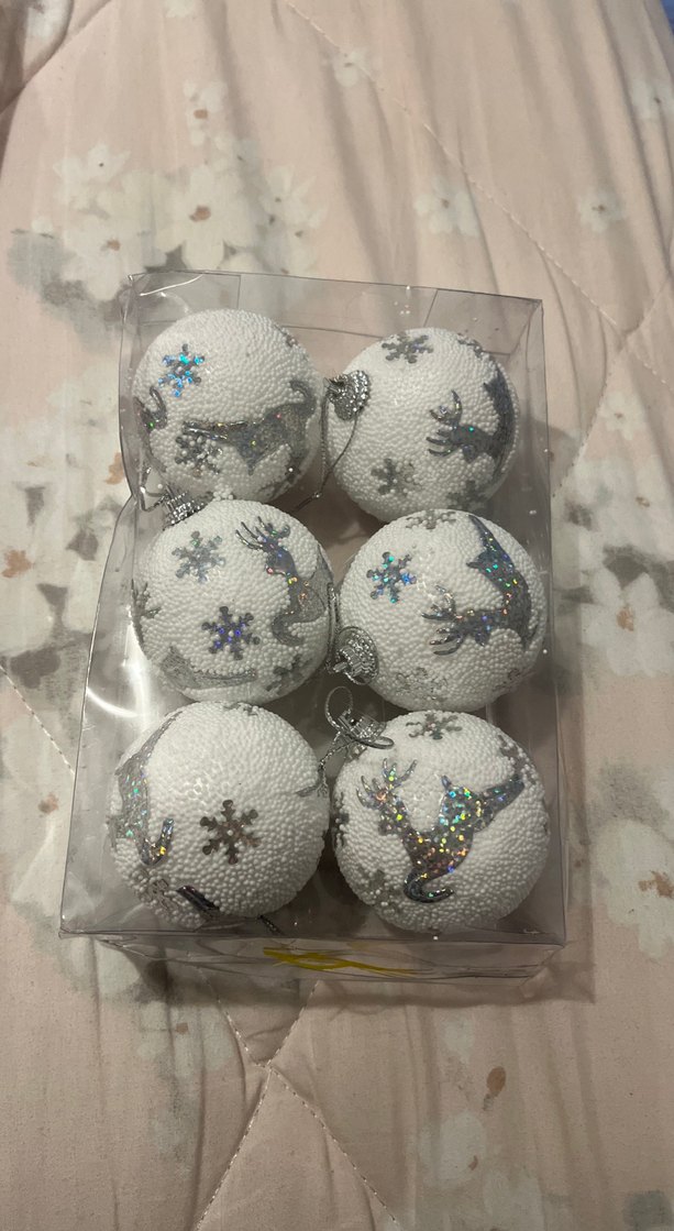 Altı adet beyaz yılbaşı süsü, geyik ve kar tanesi desenli, dokulu yüzeye ve ışıltılı detaylara sahip.
