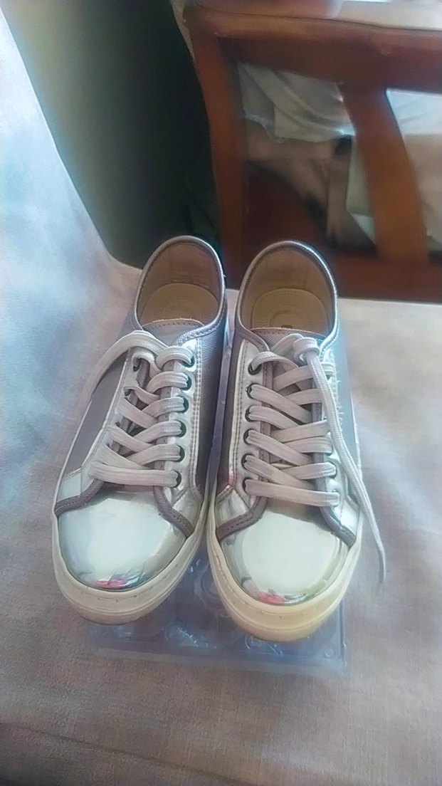 Beyaz renkte, bağcıklı ve gri kauçuk tabanlı kadın spor ayakkabısı, ince topuklu ve günlük sokak stiline uygun.