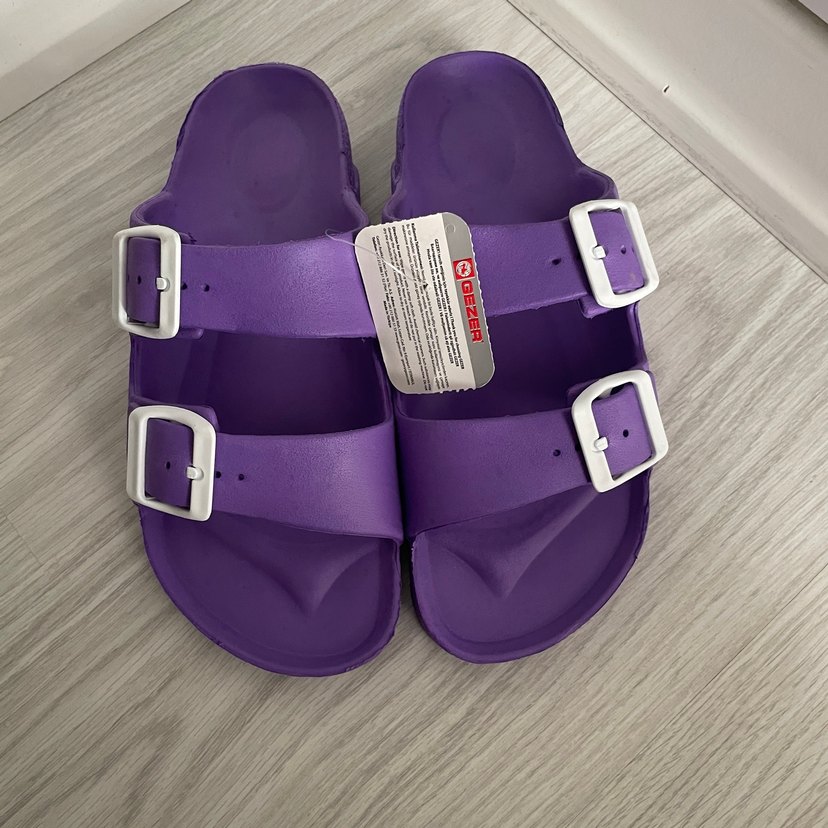 Ben 39 giyiyorum bana küçük geldi 38 veya 38,5 giyene tam olur Mor, tokalı ve dolgu topuklu kadın terlikleri. Kauçuk malzemeden yapılmış, desensiz sade tasarıma sahiptir. Günlük kullanıma uygundur
