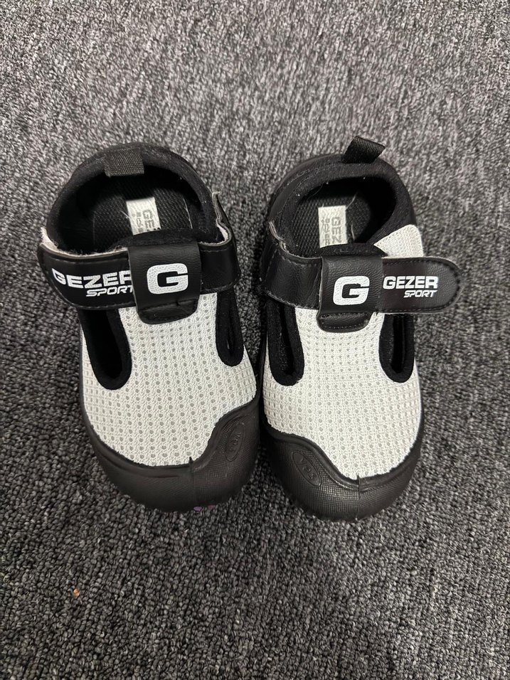 GEZER marka, gri zebra desenli, kauçuk tabanlı, cırt cırtlı erkek çocuk terliği. Rahat ve günlük sokak stili için uygun.