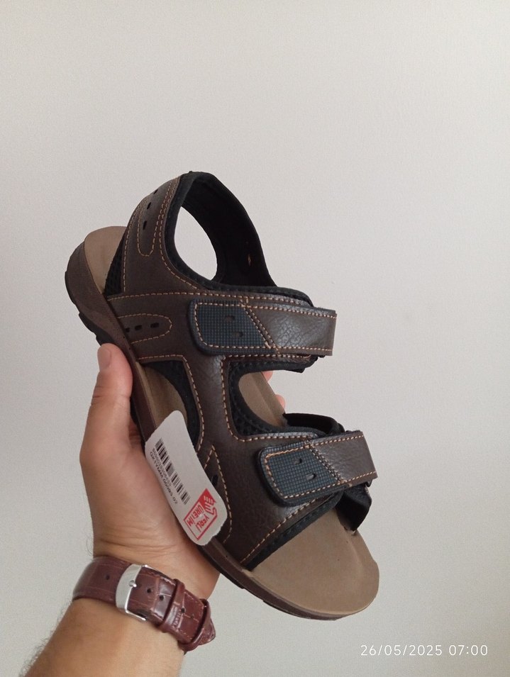 Sıfır etiketli üründür. Gezer markadır. Kahverengi suni deri erkek sandalet, tokalı kayışlar ve desenli detaylara sahip, günlük sokak stili için uygundur.