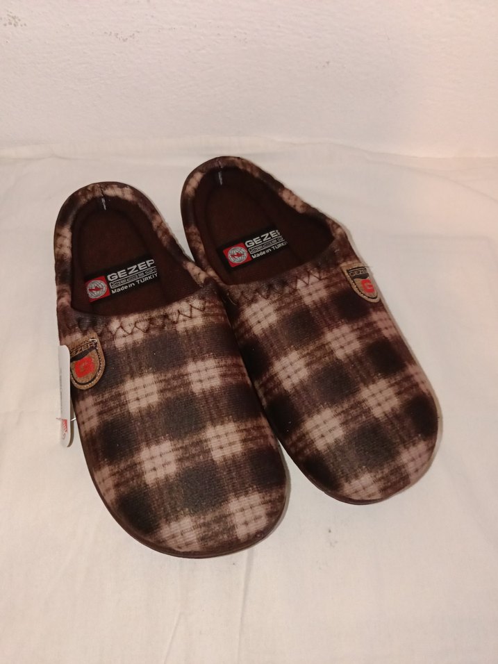 Erkekler için yumuşak ve sıcak kumaştan, koyu kahverengi ekose desenli terlikler. Düz tabanlı ve tokalı, klasik ve rahat bir tasarıma sahiptir. Yeni etiketli 42 numara erkek ev terliği (41-42-43-45 numaraları kaldı)