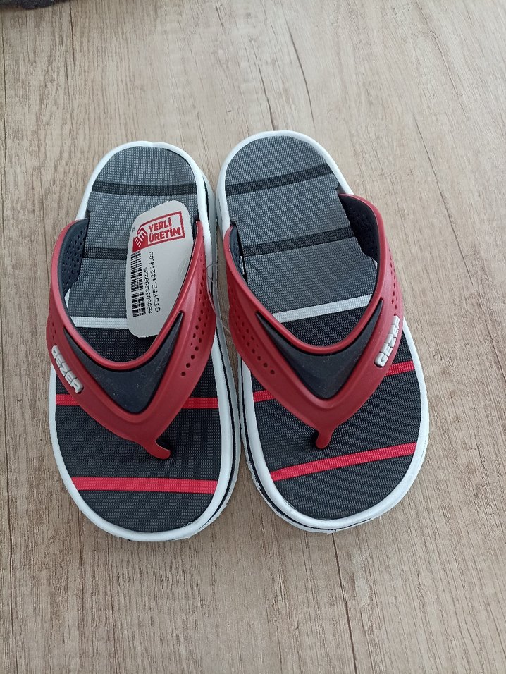 Kırmızı tokalı kayışa sahip, gri desenli tabanlı erkek çocuk terliği. Kauçuk malzemeden üretilmiştir.31 numaradır.