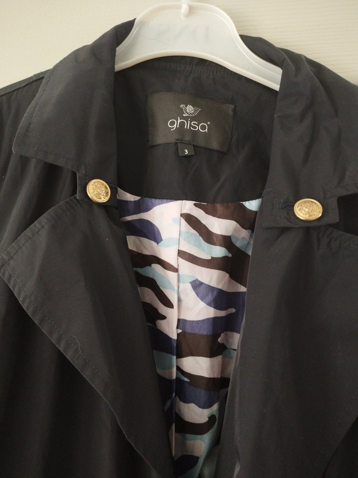 Düğmeli kapamalı, notched lapel yakalı siyah midi trençkot. Sentetik kumaştan, bol kesim ve uzun kollu. Baskılı astarıyla günlük kullanıma uygun. Marka: ghisa.