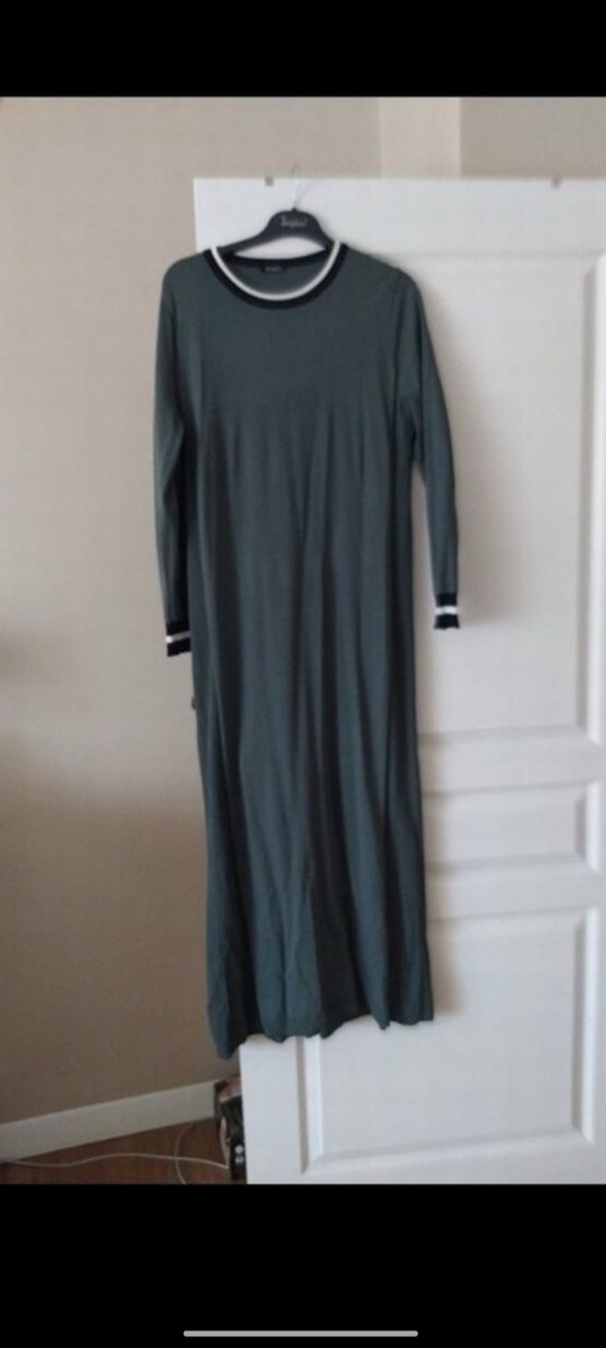 Gri renkte, uzun kollu, yuvarlak yakalı, salaş kesim uzun elbisedir. Yumuşak sentetik kumaştan yapılmıştır, günlük sokak stili için uygundur. 40 44 bedene uygun