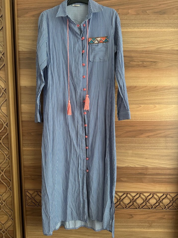 Püsküllü ve nakış detaylı, uzun kollu, gri bohem tarzda bol kesim uzun gömlek. Rahat ve retro bir görünüm sunar.
