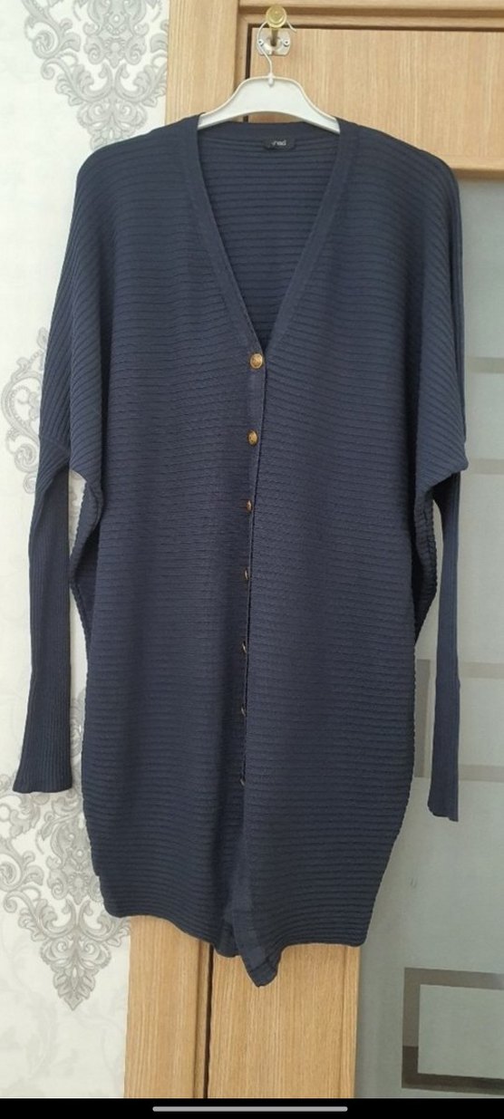 Gri renkte, düğmeli, uzun kollu, V yaka ve bol kesim triko hırka. Rahat ve günlük kullanıma uygun uzun boy tasarım.