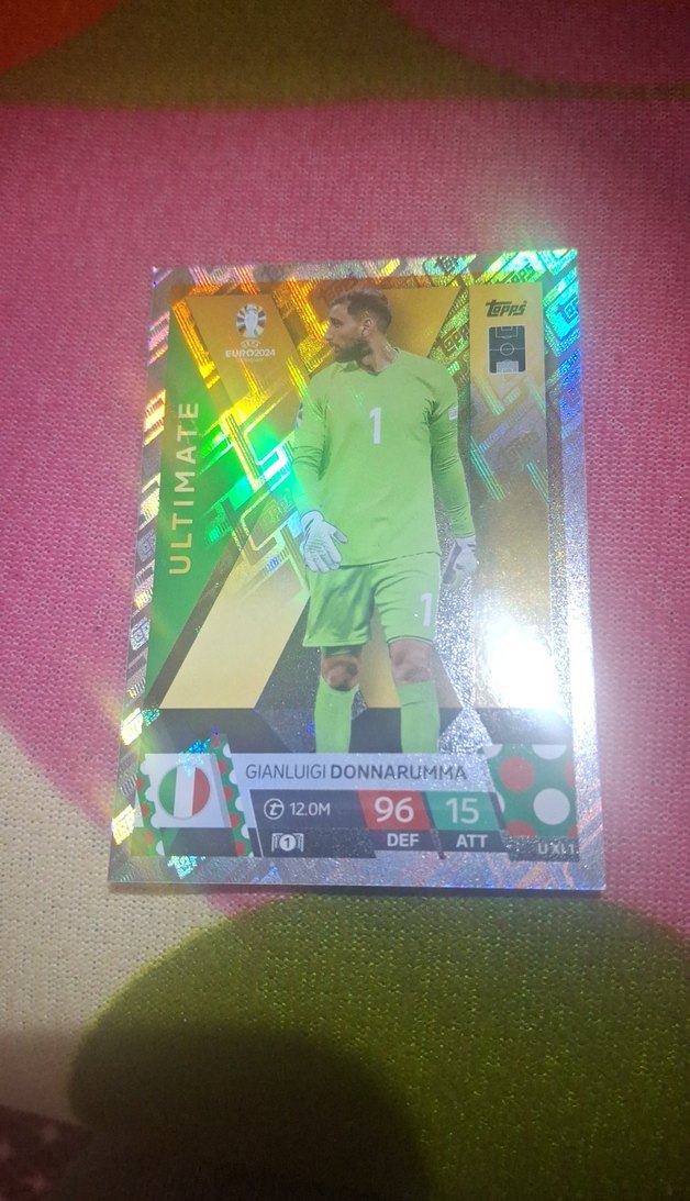 Gianluigi Donnarumma'nın yeşil kaleci formasıyla yer aldığı holografik futbol kartı, pop kültür tarzında ve detaylı istatistiklerle süslenmiştir. ⚽
