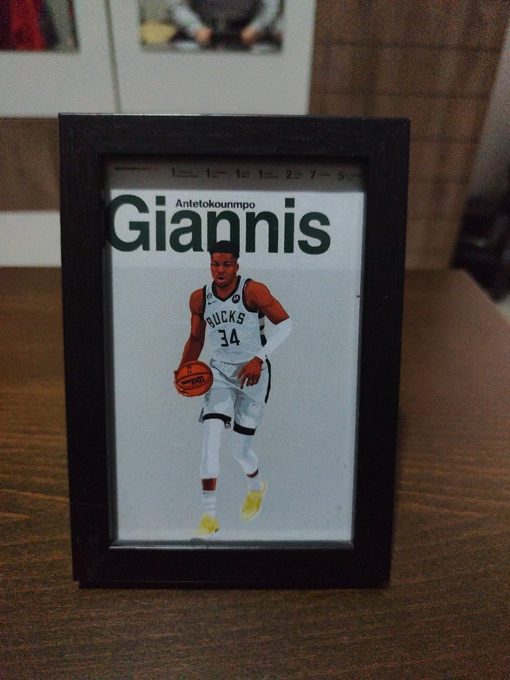 Giannis Antetokounmpo'nun 34 numaralı Bucks formasıyla kapağı olan çerçeveli basketbol Portre