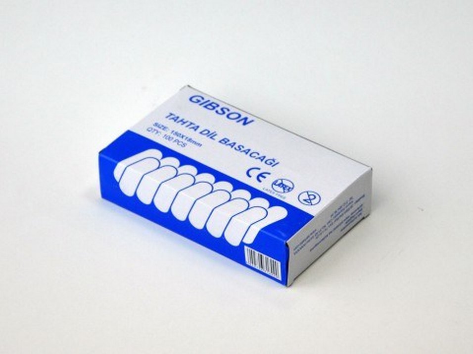 Gibson tahta dil başacağı, 150x18mm boyutunda 100 adet içerir. CE sertifikalıdır ve medikal kullanım için uygundur.