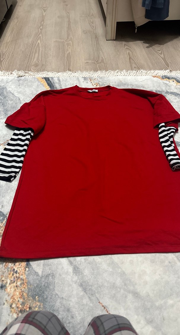 Kırmızı renkte, uzun kollu, salaş kesim hamile tişörtü. Siyah beyaz çizgili katmanlı kol detayı ve yuvarlak yaka ile günlük kullanıma uygun. Standart beden