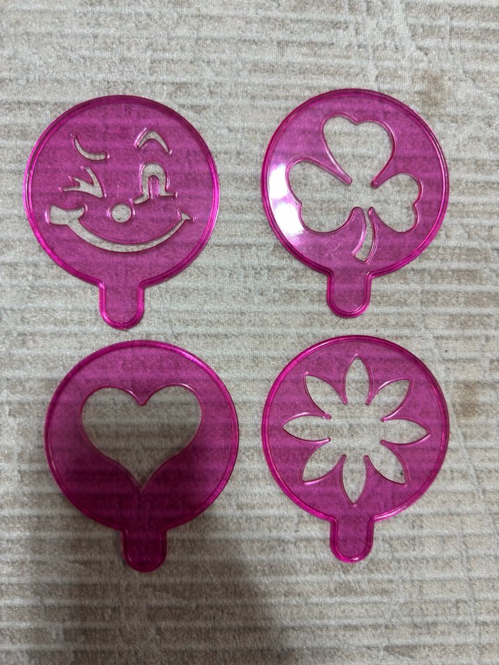 Pembe renkte, gülümseyen yüz, yonca, kalp ve çiçek desenli tatli kahve susleme şablonları.
