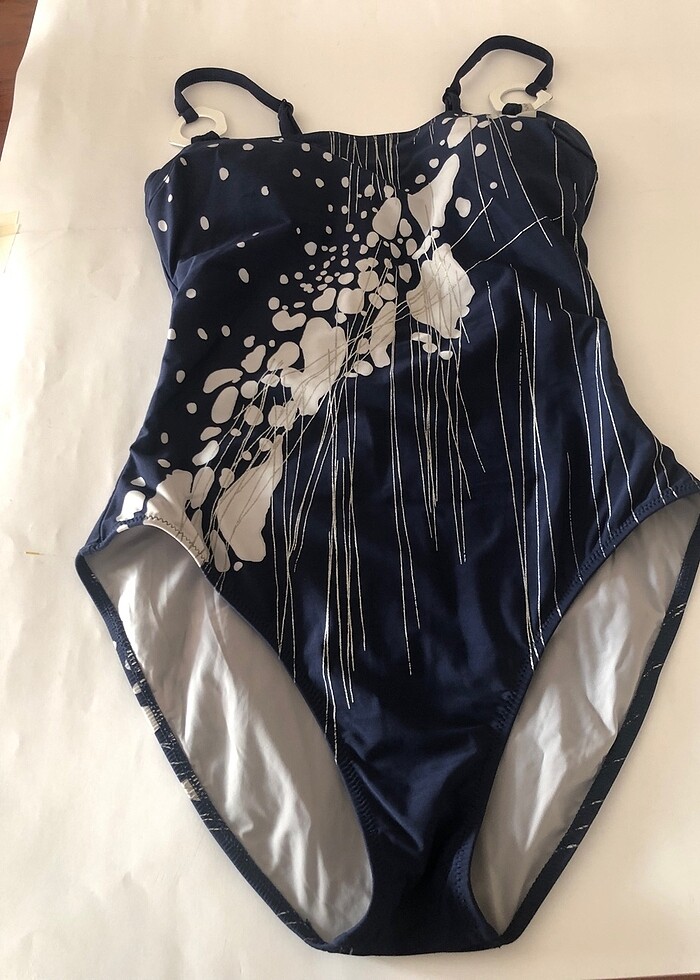 73% nylon , 27%lycra , lacivert fonlu , önü düz beyaz halkalı ince brötelli , beyaz ve gümüş desenli mayo .