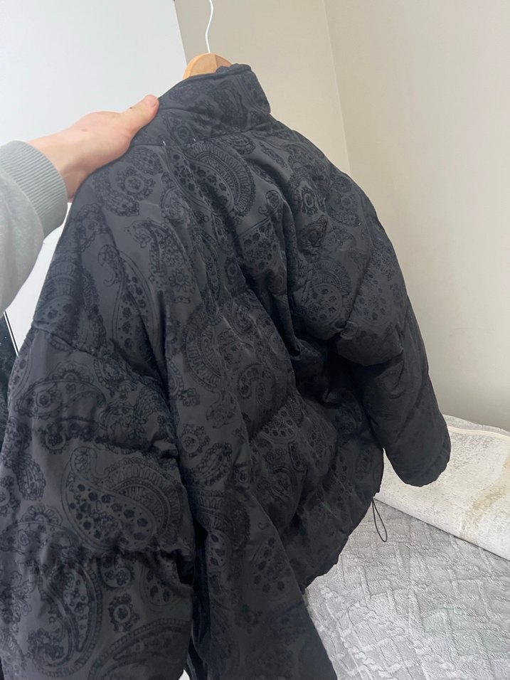 Yüksek yakalı, desenli sentetik kumaştan yapılmış, bol kesim erkek kadın kışlık mont. Uzun kollu ve detaylı, rahat ve şık deformesiz
