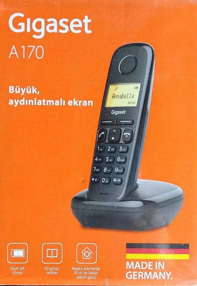 sıfır ürün kutusunda Gigaset A170, büyük aydınlatmalı ekran ve 50 kişilik rehbere sahiptir. Uzun pil ömrü ve kapalı alanlarda 50 m'ye kadar çekim gücü sunar. Almanya yapımı.