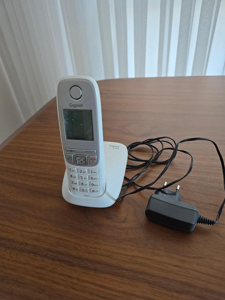 Gri ekranlı ve sayısal tuş takımlı beyaz Gigaset kablosuz telefon, güç adaptörü ile birlikte. Az kullanıldı
