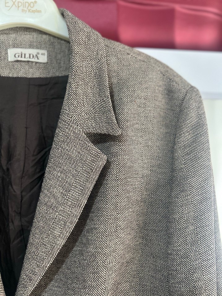 Gilda markalı, düğmeli ve uzun kesim gri blazer ceket. Sentetik kumaştan, ofis kullanımı için uygun, klasik ve şık.