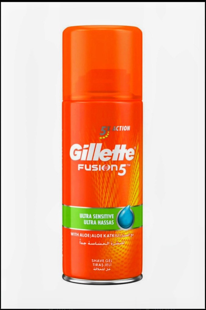 Gillette Fusion5 Ultra Hassas tıraş jeli,75ml aloe katkılı, parlak turuncu kutuda, hassas ciltler için uygundur.
