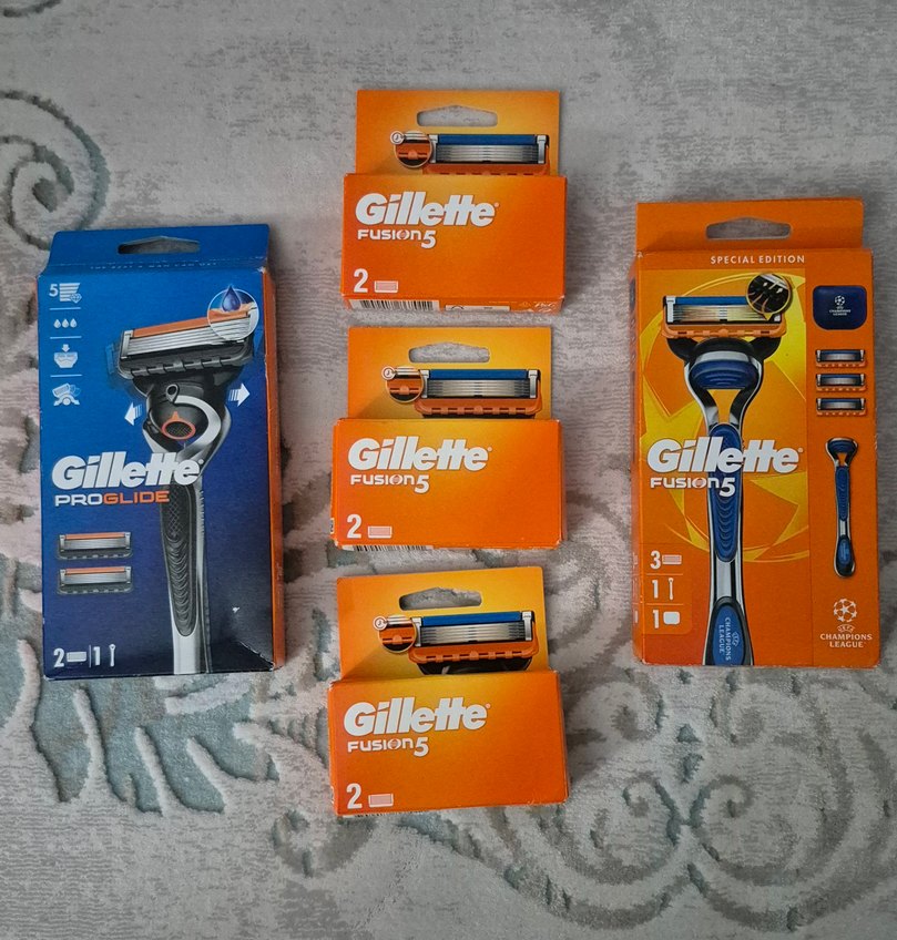 Gillette Fusion5 tıraş bıçakları, gri renkli, çoklu yedek paketleriyle uzun ömürlü kullanım sağlar. Her pakette iki bıçak bulunur. Gillette Fusion5 Şampiyonlar Ligi özel 1 sap ve 3 yedek bıçak + 3x2=6 Toplam 9 adet Fusion yedek bıçak + ProGlide 1 sap ve 2 yedek başlık #gillette #wilkinson #bic #bictras #bictiras #arko #derby #permatik