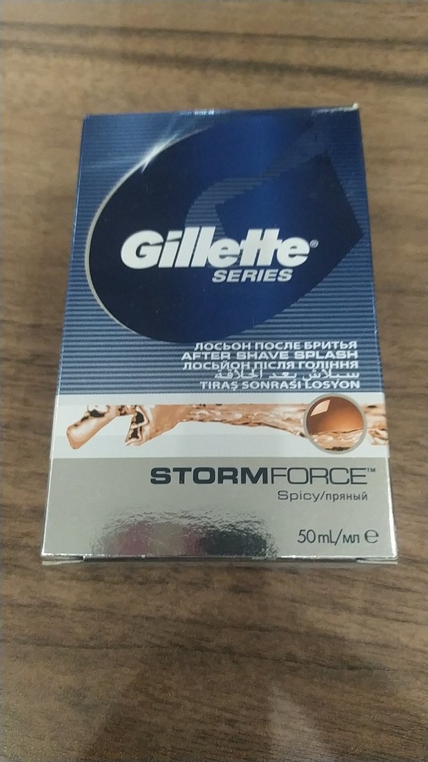 Gillette Series Stormforce tıraş sonrası losyon, parlak bej kutuda, baharatlı kokuya sahip. 50ml hacminde tıraş sonrası bakım ürünü.