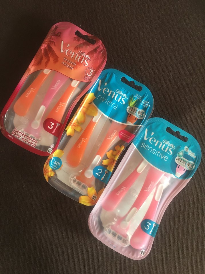 Gillette Venus tıraş bıçakları, pürüzsüz tıraş için 2-3 bıçaklı, pastel renkli saplara sahip. Smooth Miami, Riviera ve Sensitive modelleri mevcuttur.