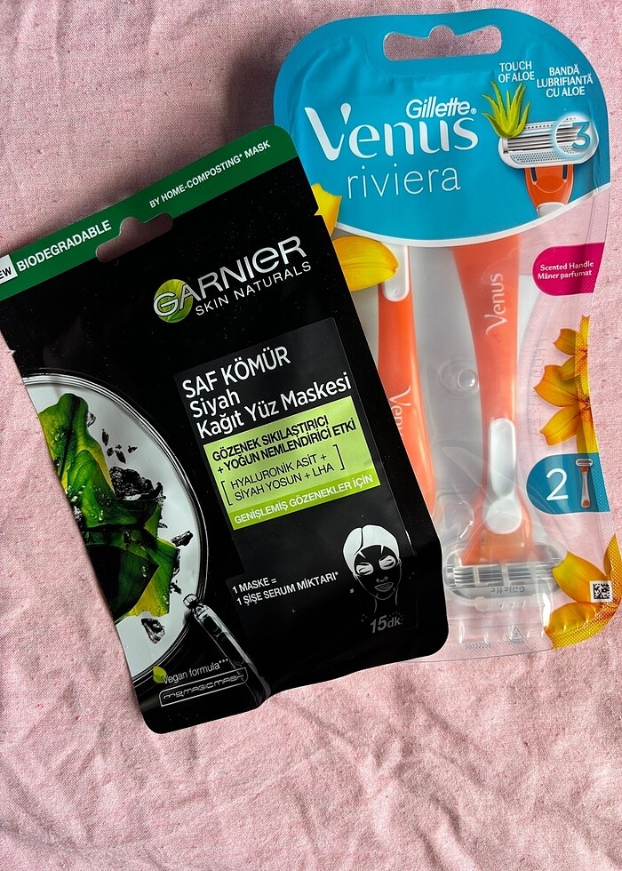 Gillette Venüs riviera ve garnier kömür kağıt maske. Sıfır ürünler ikisinin fiyatıdır.