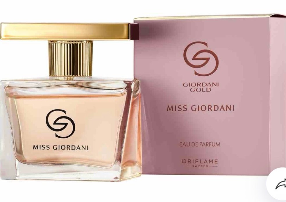 Oriflame Giordani Gold Miss Dani kadın parfümü, şeffaf cam şişede altın kapaklı, şık ve zarif kokusuyla sunulur. Pembe kutuda.