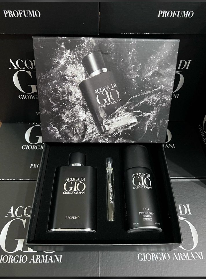 Giorgio Armani Acqua Di Gio Profumo set, siyah şişede karizmatik, çağdaş ve koyu renkte parfüm, deodorant ve deneme spreyinden oluşur.