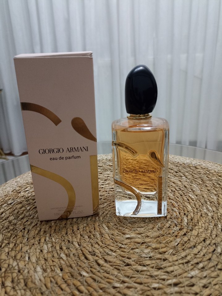 Giorgio Armani Eau de Parfum kadın parfümü, şık şeffaf şişede siyah kapaklı, orijinal bej ve altın renkli kutusunda sunulmaktadır.