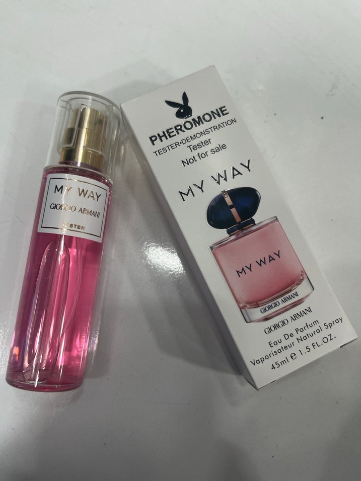 Giorgio Armani My Way kadın parfümü, 45 ml sprey şişede pembe sıvı ve altın kapak ile. Tester versiyon, 'Pheromone' etiketiyle, satışa uygun değil.