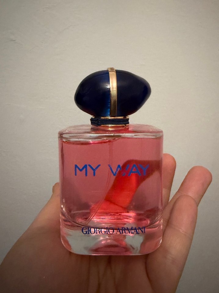 Giorgio Armani My Way kadın parfümü, pembe sıvı ve şık koyu kapaklı şeffaf dikdörtgen şişede sunulur. Zarif ve modern tasarım.