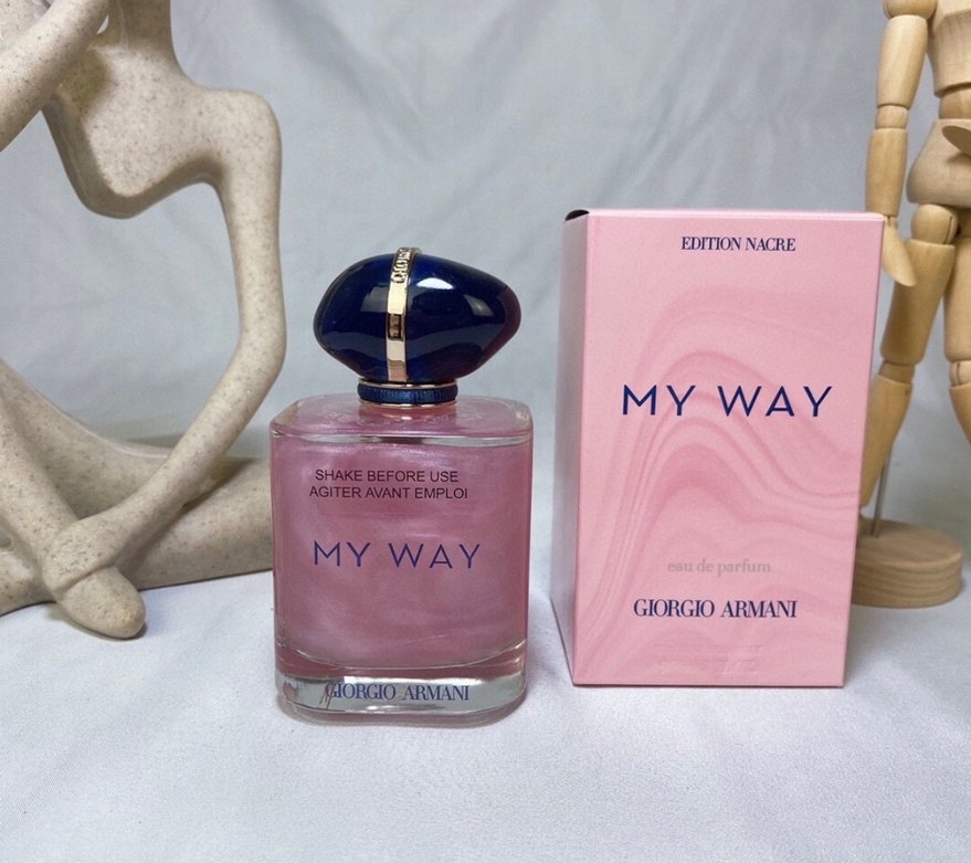 Giorgio Armani My Way kadın parfümü, pembe şişesi ve şık kapağı ile. En iyi koku için kullanmadan önce çalkalayınız. Edition Nacre serisi.