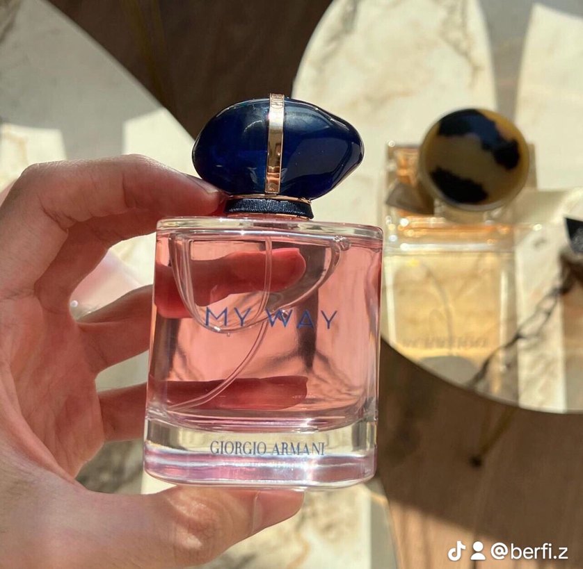 Giorgio Armani My Way kadın parfümü, pembe renkli kokusu ve koyu mavi kapaklı şeffaf cam şişesiyle dikkat çekiyor. Ferah ve zarif bir koku sunar.