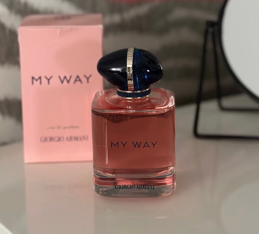 Giorgio Armani My Way kadın parfümü, pembe sıvı ve koyu mavi kapaklı cam şişede sunulmaktadır. Şişe ve kutuda marka ve koku adı belirgindir. hiç kullanılmadı