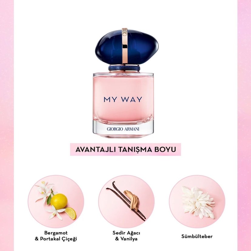 Giorgio Armani MY WAY kadın parfümü, bergamot, portakal çiçeği, sedir ağacı, vanilya ve sümbülteber notalarıyla ferah ve çiçeksi bir koku sunar.